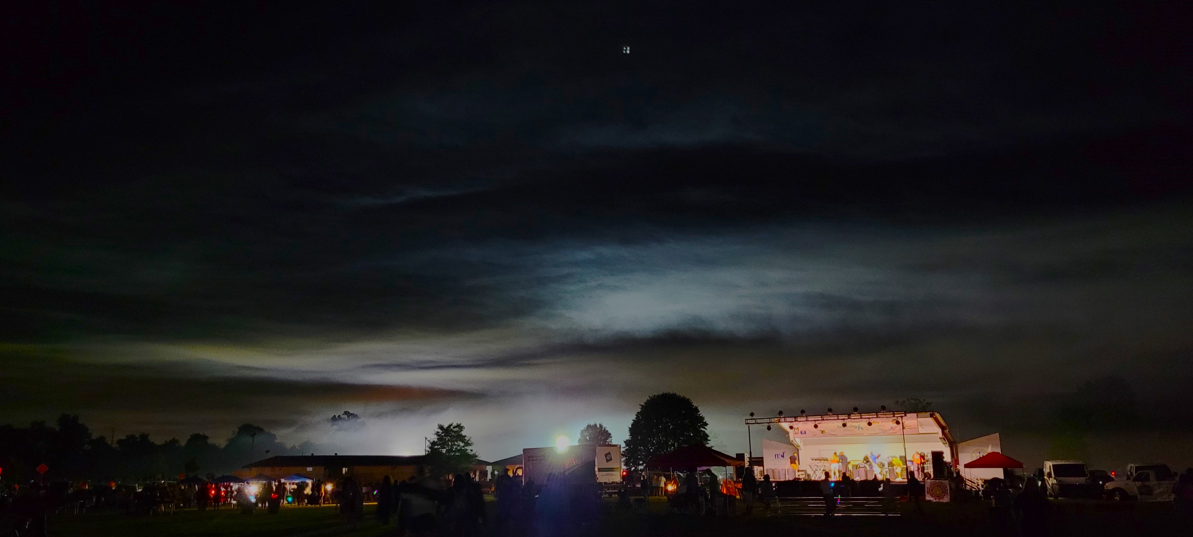 The aftermath of a dazzling spectacle unfolds like a dreamlike canvas. A serene moon hangs high in the sky, its pale glow casting an ethereal light on the scene below. Wisps of smoke, like ghostly dancers, drift lazily across the darkened heavens, their forms ever-changing, a testament to the recent fireworks extravaganza. At the heart of the image, a stage stands illuminated, a beacon of activity in the otherwise tranquil scene. Its outline, softened by the veil of smoke, hints at the music and energy that once filled the air. Around it, a cluster of lights marks the location of the once bustling vendor booths. The crowd, once a vibrant tapestry of excitement, has dispersed, leaving behind a sense of quiet reflection. The park itself, bathed in a silvery glow, takes on a mysterious allure, a place where memories of the night's magic linger. #SmithPark #MiddletownOhio #FireworksAftermath #Moonlit #Smoke #ConcertStage #NightVibes #Tranquility #Reflection #PostCelebration #TheSiliconFalcon